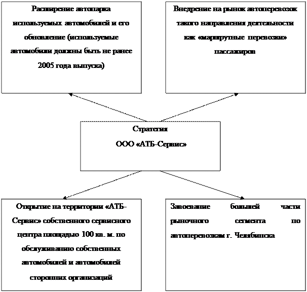 В связи с избыточным количеством функций у директора, решено создать отдел маркетинга который возьмет на себя часть функций, таких как: реклама, привлечения новых клиентов, ценовая политика предприятия, изучения рынка перевозок. 4.2 Обоснование стратегии развития организацииСтратегия представлена на рисунке 5. Она предусматривает обновления автопарка, что положительно скажется на качестве транспортных услуг, вследствие уменьшения аварийных ситуаций во время работы и сокращения простоя автомобиля на текущем ремонте. Предусмотрена диверсификация предприятия, за счет создания нового направления деятельности , как маршрутные перевозки» пассажиров, что сможет уменьшить влияние грузоперевозок. А так же создания собственного сервисного центра, это позволит снизить расходы на ремонт и обслуживание собственного парка, а также позволит получать прибыль за обслуживания машин других организаций или физических лиц. Это позволит предприятию более стабильно осуществлять свою деятельность. В связи с избыточным количеством функций у директора, решено создать отдел маркетинга который возьмет на себя часть функций, таких как: реклама, привлечения новых клиентов, ценовая политика предприятия, изучения рынка перевозок. Стратегия строится на основе ряда специальных политик: кадровая политика, финансовая политика, техническая политика, маркетинговая политика, имущественная политика [14]. В таблице 9 представлены имущественная, маркетинговая, кадровая и финансовая политики предприятия ООО «АТБ-Сервис». Таблица 9 – Политики предприятия ООО «АТБ-Сервис»