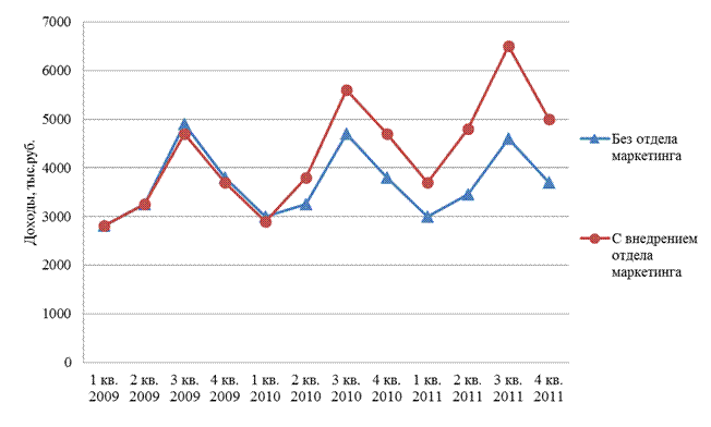 Рисунок 6 – Оценка эффективности внедрения отдела маркетинга на предприятии ООО «АТБ-Сервис» Из представленного графика видно, что линия чистой прибыли предприятия с внедрением маркетингового плана и учреждением отдела до 2 квартала 2011 года находится ниже линии доходов компании с ранее существующей организационной структурой. Это объясняется дополнительными затратами на офисное оборудование, заработную плату и рекламный комплекс мероприятий. Однако после происходит увеличение выручки на 15 процентов ежегодно и вторая кривая все больше отодвигается вверх. Далее приведем планируемую структуру клиентов ООО «АТБ-Сервис». Данная структура приведена в таблице 7. Таблица 7 – Планируемая структура клиентов ООО «АТБ-Сервис» на 2011-2013 г.г.
