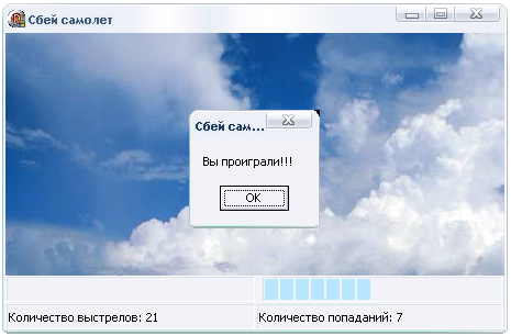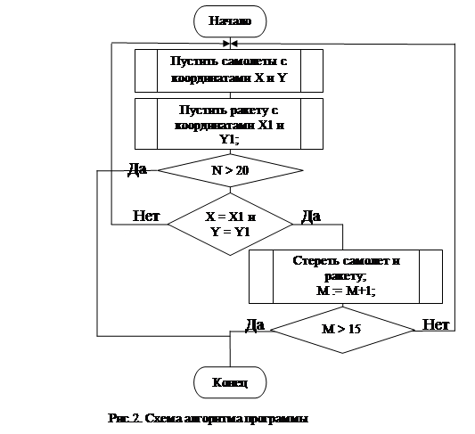 Программа выполняется следующим образом: Сначала на форму выводятся объекты – летящие самолеты, и пушка. Игрок запускает ракету, которая может сбить или не сбить самолет. За один раз можно пустить только одну ракету. В момент запуска увеличивается счетчик пуска ракет. Если ракета попадает в самолет, то стирается самолет и ракета, увеличивается счетчик попаданий, самолет начинает «полет» снова, а игрок получает право пустить следующую ракету. Если игрок не попал в самолет, ракета долетает до верхней границы окна, и игрок получает право пустить следующую ракету. Если счетчик выстрелов или попаданий достигает своего максимально-допустимого предела, то программа выдает соответствующее сообщение. После нажатия игроком на кнопку «ок» все счетчики сбрасываются, и программа начинает свое выполнение сначала. Схема алгоритма программы представлена на рис.2.