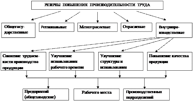 Рис. 1. Классификация резервов по уровню их возникновения [12; 113] 1. Общегосударственные — это макроэкономические резервы. Их использование оказывает влияние на рост производительности труда в реальном секторе экономики страны. Они связаны с рациональным размещением производства по территории страны с учетом наличия сырьевых и других материальных ресурсов, квалифицированной рабочей силы, состоянием занятости населения, недоиспользованием рыночных методов хозяйствования и т.д. 2. Наличие региональных резервов свидетельствует о возможности более рационального и оптимального использования производительных сил, характерных для данного региона. 3. Межотраслевые резервы определяются необходимостью улучшения межотраслевых связей, транспортных потоков продукции, укрепления договорной дисциплины между предприятиями разных отраслей. 4. Отраслевые резервы указывают на возможности повышения производительности труда за счет развития эффективной специализации и кооперации предприятий внутри конкретной отрасли экономики. 5. Самую большую группу резервов роста производительности труда составляют внутрипроизводственные резервы. Они определяются недостатками в использовании на предприятии сырья, материалов, оборудования, рабочего времени и рабочей силы. Серьезные резервы этой группы обусловлены низким уровнем автоматизации и механизации труда на вспомогательных работах и в подсобных производствах. В последнее время не уделяется должного внимания выявлению резервов повышения производительности труда на отдельных рабочих местах. Между тем, исследования доказали, что на самом низовом уровне имеется большое количество неиспользованных резервов для снижения затрат. По времени использования резервы роста производительности труда подразделяются на текущие и перспективные. [21;125] -Текущие резервы могут быть реализованы в ближайшем периоде и, как правило, не требуют значительных единовременных затрат. К их числу можно отнести лучшее использование оборудования, применение наиболее рациональных и эффективных систем оплаты труда, совершенствование организации труда на предприятии торговли и его нормирования. [21;125] -Перспективные резервы роста производительности труда обычно требуют перестройки производства, внедрения новых технологий и т.д. Для этого необходимы дополнительные капитальные вложения и значительные сроки осуществления работ. [18;126] В торговле производительность труда не в полной мере характеризует его эффективность, так как значительная часть затрат способствует повышению качества обслуживания населения. Наиболее приемлемым показателем является эффективность труда. Понятие эффективность труда в торговле более широкое, чем производительность, и предполагает не только соизмерение полученного экономического результата с затратами живого труда, но и оценку социального эффекта. Социальный эффект выражается в наиболее полном удовлетворении спроса населения на товары, в повышении культуры торговли и качества обслуживания покупателей, в сокращении издержек потребления (экономии времени покупателей на приобретение товаров и др.). [6;32] Эффективность труда характеризуется следующими показателями: - производительность труда; - уровень затрат труда на единицу товарооборота; - прибыль на одного работни