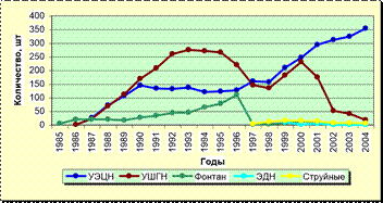 Геолого-физические параметры пластов отличаются незначительно, так средняя глубина залегания пластов составляет 2340-2376 м, давление насыщения нефти газом – 8,7-7,0 МПа, газосодержание нефти 89-69 м3/т, пластовая температура 82ºС. На месторождении нет обширных газовых и водоплавающих зон. Данная характеристика пластов и нефти является нормальной для добычи нефти любым механизированным способом. За время разработки месторождения (около 20 лет) кроме основных запроектированных способов добычи (УЭЦН, УШГН) на месторождении были испытаны электродиафрагменные и струйные насосные установки. Динамика распределения действующего фонда скважин по способам и динамика добычи нефти приведены на рисунках 3.1 и 3.2