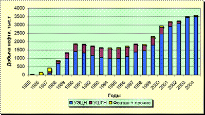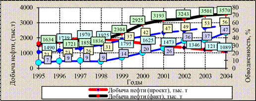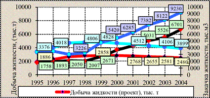 Хохряковское месторождение в геологическом отношении является сложнопостроенным, что связано с высокой площадной неоднородностью и неоднородностью по разрезу продуктивных отложений. В предыдущем проектном документе на месторождении выделен один эксплуатационный объект ЮВ1-2 . На данном этапе разработку месторождения ведет ОАО «Нижневартовское нефтегазодобывающее предприятие» на основании «Дополнения к технологической схеме разработки Хохряковского месторождения», выполненного СибНИИНП в 1995 году и утвержденного ЦКР МинТопЭнерго (протокол № 1877 от 25.09.95 г.). Месторождение разрабатывается по блочно-замкнутой системе при трех-пятирядном размещении скважин в блоках. Сравнение проектных и фактических показателей приведено в таблице 4.1. Как видно из таблицы фактические показатели разработки существенно отличаются от проектных показателей в большую сторону. Проектом предусматривалось завершение бурения в 1998 году. Всего на месторождении к 2004 году по проекту должно быть реализовано 692 эксплуатационных скважины. Фактически реализованный фонд Хохряковского месторождения, по состоянию на 1.01.2005 г., составил 788 скважин (96,9 % от проектного с учетом резерва), в том числе 528 добывающих и 260 нагнетательных скважин. Максимального уровня добыча жидкости достигла в 2004 году и составила 6 701 тыс.т., что выше проектной величины (2 480 тыс.т.) на 4 221 тыс.т. (170 %). Весь послепроектный период (1995-2004 г.г.) характеризуется растущей добычей. При этом период с 1995 по 1999 г. характеризуется отставанием от проектных величин (фактическая добыча составляла от 72 до 93 % от проекта), а после 2000 года отборы жидкости значительно превышали проектное значение. По состоянию на 1.01.2005 года накопленная добыча жидкости составила 47 935 тыс. т (по проекту 37 981 тыс. т). Добыча нефти в период с 1995 по 1998 год практически соответствовала проекту, составляя от 90 до 110 % проектной величины. Начиная с 1999 года, отмечается значительной рост добычи нефти и если в 1999 году превышение проектного уровня добычи нефти составляло 30 %, то в 2004 году отбор нефти более чем в три раза превышал проект (рисунок 4.1).