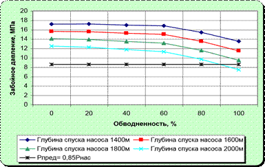 Рис. 3.8. Зависимость минимального забойного давления в скважинах, оборудованных ШГН, от глубины спуска насоса и обводненности При этом были приняты следующие допустимые значения газосодержания на приеме насоса: ЭЦН – 25 %, ШГН – 15 %. В вариантах использования газовых сепарато-ров и газовых якорей газосодержание на приеме принято: ЭЦН – 40 %, ШГН – 30 %. Принятые предельные забойные давления (10,0-11,0 МПа) будут достигаться при спуске установок ЭЦН на глубину не более 1800 м с газосепаратором и 2000 м без газосепаратора. На низкодебитных скважинах фонда УШГН рекомендуется спускать насосына глубину 1650-1750 м при этом Рзаб будет равным 14,0-11,5 МПа.