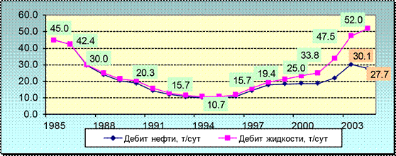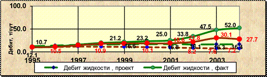 Рис. 4.1. Динамика добычи нефти и обводненности (проект-факт) На 1.01.2005 г. накопленная добыча нефти на Хохряковском месторождении составила 37 264 тыс. т, при проектном значении 26 904 тыс. т. Темп отбора от начальных извлекаемых запасов равен 3,9 %, от текущих извлекаемых запасов – 6,1 %, КИН – 13 %. Обводненность в 2004 году увеличилась по отношению к 2003 году на 10,1 % и составила 46,7 %, что ниже предусмотренного проектом значения – 56,1 % (рис. 4.1). Дебиты жидкости и нефти характеризуются постоянным ростом за последние 10 лет (рис. 4.2).