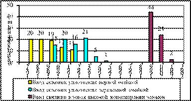 Рис 3.5. Динамика отказа фонда скважин, оборудованных УШГН Таким образом, наблюдаемая на месторождении тенденция снижения забойного давления ухудшает характеристики надежной работы погружного оборудования и ведет к дополнительным расходам на ремонтные работы. По основному способу добычи (УЭЦН) в призабойной зоне создаются условия снижающие продуктивность скважины по нефти. Проектом предусматривается разбуривание и ввод новых скважин в основном на водонефтяных зонах месторождения (северная и западная части месторождения). На основании анализа и разбуривания месторождения в ВНЗ рекомендуется на вновь вводимых скважинах ограничивать забойные давления в пределах 10 - 11 МПа.