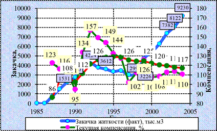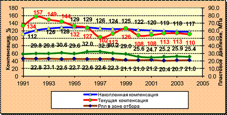 Динамика пластового давления в зоне отбора и в зоне закачки, а так же текущая и накопленная компенсации приведены на рисунке 4.21. В период с 1991 по 1995 год пластовое давление в зоне отбора незначительно снижалось с 23,1 МПа до 22,7 МПа, этот этап соответствует реализации пяти-рядной системы заводнения и характеризуется растущей накопленной компенсацией и текущей компенсацией 130-140%. В дальнейшем на месторождении, начиная с 1995 года, реализуется блочно замкнутая система, создаваемая за счет введения поперечных разрезающих рядов. Период с 1995 по 2004 год характеризуется значительным увеличением отборов жидкости и закачки (таблица 4.7). Текущая компенсация при этом постепенно снижается с 132 % в 1995 году до 110 % в 2004 году. Накопленная компенсация при этом снижается со 129 % в 1995 году до 117% в 2004 г.