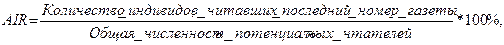 Например, количество читавших последний номер газеты X составляет 50 000 человек, количество потенциальных читателей — 200 000, следовательно, AIR = (50 000/200 000) • 100% = 25%. - Профиль аудитории — процент целевой социально-демографической группы населения в читательской аудитории издания. Рекламодатель получает возможность нацеливать свое обращение на тщательно отобранные группы потенциальных покупателей и предотвратить тем самым появление бесполезного тиража. - Индекс соответствия — это умноженное на 100 отношение рейтинга периодического издания в целевой группе к его рейтингу среди населения города в целом. Чем больше значение индекса соответствия издания в целевой группе, тем более направленным на нее будет воздействие рекламы, размещенной в данном издании. Значение индекса в пределах 200, означает, что в целевой группе читатели данного издания встречаются в 2 раза чаще, чем среди всего населения, а следовательно, проявляют повышенный интерес к изданию. С понижением индекса снижается число читателей в целевой группе. Значение индекса в пределах 80—120 говорит о примерно одинаковом интересе к изданию как в целевой группе, так и у населения города в целом. - Объем реализации — он представляет собой ту часть тиража, которая продана в розницу, получена по подписке, вручена бесплатно. - Периодичность издания — ежедневные газеты предоставляют возможность опубликовать рекламу в конкретный день и повторять обращение несколько раз в течение недели; ежемесячные и ежеквартальные издания играют роль долговременных напоминателей. Критерием оценивающим периодичность выступает частота, т.е. сколько раз аудитория имела возможность увидеть рекламу в газете. Определяется по формуле 3: - Индекс избирательности (Iизб ) – это сравнение процента аудитории, приходящегося на долю носителя рекламы целевого рынка, с процентом населения, составляющего этот рынок. Определяется по формуле 4: где в – доля читателей носителя рекламы на целевом рынке, %; dup – доля неселения, составляющая целевой рынок, %. - Валовой оценочный коэффициент — процент аудитории, охватываемый рекламным объявлением. - Рекламные издержки — определяются с помощью показателя тиража и стоимости полосы рекламы. Например, газета тиражом 40 000 экземпляров при стоимости рекламы формата А4 30 000 руб. имеет такие затраты на привлечение потенциального клиента: 3 = 30 000/40 000 = 0,75 руб. = 75 коп. Нормы рекламных издержек на человека для разных товаров различны, отличаются они и в разных регионах. Приемлемой считается норма 3 руб. на одного человека. 3) Телевиденье: - Охват аудитории. Эта характеристика выражается в тысячах слушателей (рейтинг) либо в доле, которую составляют телезрители канала, относительно населения (рейтинг, %); - Средняя частота повторения. Эта величина, показывающая, сколько раз средний представитель целевой аудитории должен познакомиться с рекламным сообщением в заданный интервал времени на конкретных программах. Определяется как (формула 5): Например, 4000 телезрителей увидели сообщение 3 раза за четыре недели и еще 4000 человек увидели его 5 раз. Для расчета частоты повторения используется следующая формула 6: