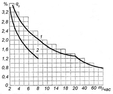 Потери тепла в окружающую среду q 5 находятся с помощью графика, представленного на рис.1. По оси абсцисс указана паропроизводительность котла. Кривая 1 относится к котлу с хвостовыми поверхностями, кривая 2 – собственно к котлу (без хвостовых поверхностей).