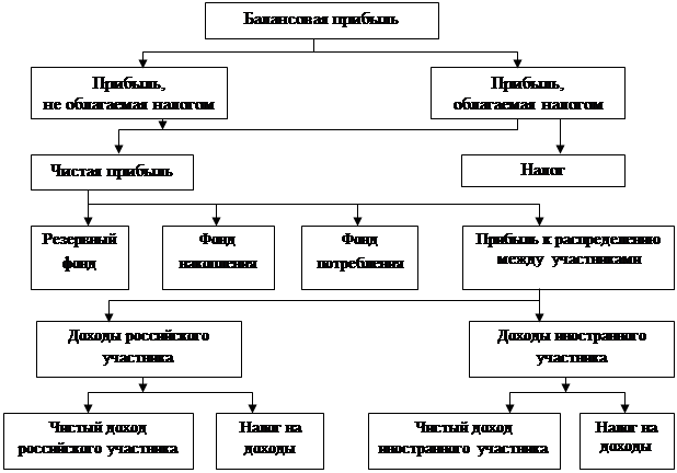 Рисунок 1 – Распределение прибыли товарищества. В учредительном договоре могут быть предусмотрены и другие условия распределения прибыли. При недостаточности прибыли вкладчики могут получить меньший процент прибыли на свой вклад, но и в этом случае договором могут быть предусмотрены иные условия (например, выплата недостающей части прибыли вкладчикам в следующем году и т.д.). В коммандитном товариществе из полученной балансовой прибыли, прежде всего, вносится в бюджет налог на прибыль, исчисленный в соответствии с порядком, установленным для юридических лиц. После этого часть прибыли направляется вкладчикам (коммандитистам) в доле, соответствующей их вкладу в капитал товарищества, затем прибыль направляется на развитие предприятия и другие цели. Остаток прибыли распределяется между действительными членами (полными товарищами).[19, 142с.] Если прибыль не получена или получена в меньшем объеме, нежели предполагалось, то возможны следующие варианты: · при отрицательных финансовых результатах действительные члены обязаны отдать вкладчикам их долю прибыли, продав имущество товарищества; · при недостаточности средств может быть принято решение о невыплате пайщикам прибыли. Прибыль общества с ограниченной ответственностью облагается налогом и распределяется в общем порядке, установленном для юридических лиц. При подведении итогов хозяйственной деятельности за год каждому участнику (пайщику) выплачивается доля прибыли, соответствующая его вкладу в уставный капитал, после внесения в бюджет налогов, других обязательных платежей, направления прибыли на развитие предприятия и материальное поощрение работников. Наиболее сложным является порядок распределения прибыли акционерных обществ. Общие механизмы распределения прибыли и порядок выплаты дивидендов фиксируются в уставе общества. Для определения ставки дивидендов необходимом рассчитать потенциальный размер прибыли, которая может быть выплачена акционером без ущерба для деятельности АО. Если прибыль, планируемую как результат хозяйственной деятельности общества за год, обозначим как Тогда