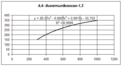 Наиболее подходящие условия для проведения процесса: 400 0С при дальнейшем повышении температуры увеличивается выход изобутилена и возрастает опасность полимеризации изопрена. Давление атмосферное. Для компенсации эндотермичности реакции разбавляют диоксан перегретым водяным паром 1: 2, который служит аккумулятором тепла и способствует повышению селективности процесса. Так как реакция разложения ДМД до изопрена идет через стадию дегидрирования, то сильное разбавление отрицательно скажется на выходе изопрена. Адиабатический перепад температур. Предположим, что масса пропускаемого 4,4-диметилдиоксана 1,3 равна 1000 кг, тогда количество молей 4,4-диметилдиоксана-1,3, подаваемого в реактор за час: νн-бутан = Где m – подаваемая масса н-бутана, кг/час; M – молярная масса н-бутана, кг/кмоль νн-бутан= На 1 моль н-бутана подается 2 моля водяного пара. В программе Microsoft Excel построим графики зависимости теплоемкости от температуры для 4,4-диметилдиоксана-1,3, изопрена, формальдегида и воды. А также для каждого из графиков определим линию тренда по полиномиальной зависимости третьего порядка: