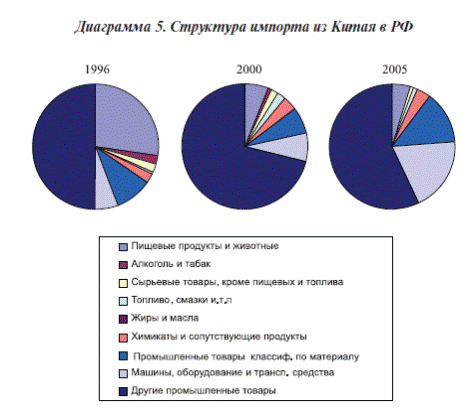 Вседостижения,наосновекоторыхбылдостигнутуспех вторговлесКитаем, былизаложены ещевсоветское время. Этотепреимущества,которыебылисозданымноголетназад. Недостатки связанысвнутреннимисвойствами такихкомпаний– неповоротливостью,неспособностьюкинновациям, отсутствиемпрактикипродвижениясвоейпродукции. Есливзятьболеерадикальнуюхарактеристикутакогоэкспорта,тостоитсказать,чтовесьэкспортцеликомиполностью основан натехдостижениях,которые были достигнуты во временаСоветского Союза. Что касается импорта, тоздесьситуация совершенно другая.Китай, как«мироваяфабрика»,экспортируетвРоссиюцелыйрядпромышленныхтоваров,нопосравнению с другимиунихтожесуществуютпроблемы.Онизаключаются втом,чтоРоссия восновном покупаеттоварыснизкой добавленнойстоимостью, продуктымассовогоспроса.Темне менее,налицотенденциясокращениякитайскогоэкспорталегкойпромышленности и еезамещения наболеетехнологичную продукцию.Доляпоследней,как ожидается, вближайшие пятьлетвозрастетвдва-три раза. При этом вэкспорте КНР вРоссию стремительно растет долямашиностроительнойпродукции(с10%в1999годудо 26%в2004году). Типичныйпортрет российскогоимпортера изКитая (Диаграмма 5)