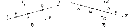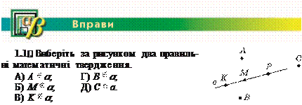 Рис. 1.1 Геометричні фігури – це абстрактні фігури, які нагадують предмети, що нас оточують. Щоб відрізняти одну геометричну фігуру (чи поняття) від іншої, їх описують у вигляді твердження, яке називають означенням. Означення – це твердження, яке описує істотні властивості предмета (поняття), що дає змогу відрізнити його від інших. Як з’ясувалося, означити всі геометричні фігури неможливо. Наприклад, точка, пряма, площина. Їх називають неозначуваними , або початковими (з яких усе починається), або основними , як називали їх у планіметрії. Логічну побудову планіметрії можна описати за такими етапами. 1. Вибір геометричних понять, які називають основними поняттями (абстрактних фігур). 2. Формулювання основних властивостей для цих геометричних понять за допомогою тверджень, які вважаються істинними без доведень. 3. Побудова інших понять, які означуються через основні поняття та їхні властивості, та тверджень, істинність яких встановлюється шляхом доведень, опираючись на відомі. Таку побудову науки називають аксіоматичною . Її назва походить від слова «аксіома». Це слово грецького походження, що в перекладі українською мовою означає повага , авторитет , незаперечна істина . Аксіома – це твердження, яке приймається істинним без доведення. Основні властивості найпростіших геометричних фігур, які вважають істинними без доведення і які є вихідними під час доведення інших властивостей, називають аксіомами гео метрії . Для шкільного курсу планіметрії визначено: 1. Основні геометричні фігури (поняття) – точка , пряма . (Точка – найпростіша геометрична фігура. Усі інші геометричні фігури складаються з точок, у тому числі й пряма .) 2. Аксіоми планіметрії – це основні властивості найпростіших геометричних фігур. 3. Систему означень планіметричних фігур і теорем, що виражають їхні властивості. До означуваних понять у геометрії відносять поняття відрізка, променя, трикутника тощо, оскільки для них існують пояснення «що це таке?». Означуваних понять багато. Наведемо приклад. Нехай на прямій а