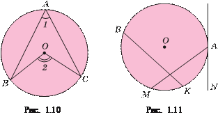 Кут з вершиною у центрі кола називається центральним кутом . Центральний кут, сторони якого перетинають коло в тих самих точках, що і вписаний, називається відповідним центральним кутом до вписаного (рис. 1.10). Міра вписаного кута дорівнює половині міри відповідного центрального або доповнює його половину до 180. Кут, утворений хордою і дотичною, яка проходить через кінець хорди, вимірюється половиною дуги, що міститься між сторонами цього кута (рис. 1.11);