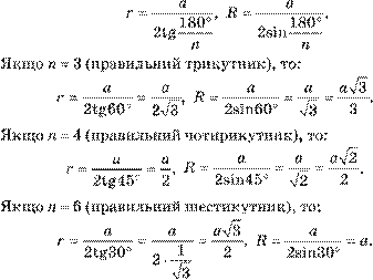 – 2). Тому кожний його кут визначається за формулою Коло, вписане в правильний многокутник, дотикається до його сторін в їхніх серединах. Центр кола, вписаного в правильний многокутник, є точкою перетину серединних перпендикулярів до його сторін (рис. 1.15). Якщо сторона правильного многокутника дорівнює а , радіус вписаного в нього кола – r , а радіус описаного навколо нього кола – R , то між ними існує взаємозв’язок, що виражається формулами: