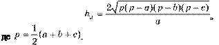 медіана, 4. Три медіани трикутника ділять трикутник на шість трикутників, площі яких рівні. Прямі, на яких лежать висоти трикутника, перетинаються в одній точці – ортоцентрі трикутника, яка може міститися у внутрішній або зовнішній області трикутника. Висоти трикутника, проведені до сторін трикутника а , b і с , позначаються ha , hb і hc відповідно. Висота трикутника ha визначається через сторони трикутника за формулою: