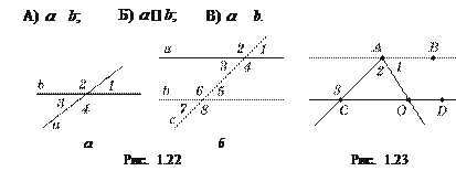 1.20 . При перетині прямих a і b утворилося чотири кути (рис. 1.22, а ). Задайте кожній з умов (А–Д) можливий наслідок (1–5).