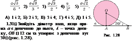 А) R ; Б) ; В) ; Г) ; Д) . 1.42 . Ідентифікуйте парами сторону правильного трикутника а та радіус r вписаного в нього кола. Рис. 1.31