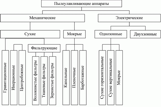 В технике пылеулавливания применяется большое число аппаратов, отличающихся друг от друга как по конструкции, так и по принципу осаждения взвешенных частиц. По способу улавливания пыли их обычно подразделяют на аппараты сухой, мокрой и электрической очистки газов.
