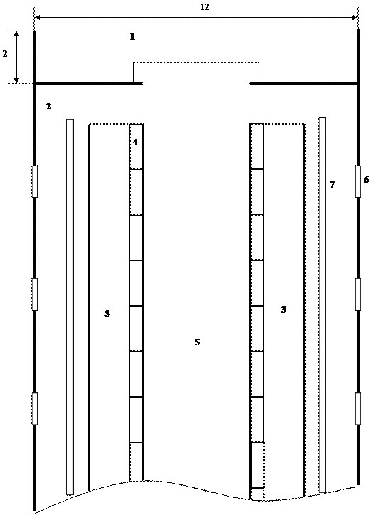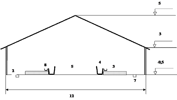 Масштаб 1:100 Где, 1 - тамбур 2 - навозный проход. 3 - групповые стойла 4 - кормушки. 5 - кормовой проход. 6 - окна 7 - навозный канал 8 - поилки. Рис. 2 Вертикальный разрез коровника для дойный коров. |