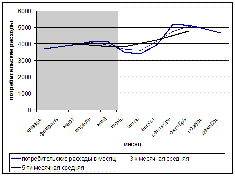 Т.е. с доверительной вероятностью p=1-α=1-0,05=0,95 можно предполагать, что прогнозное значение потребительских расходов при величине дохода, равной 10000 рублей, составит около 4691,08 рублей. Таким образом, в результате проведения корреляционно-регрессионного анализа показано, что между величиной дохода и величиной потребительских расходов существует тесная связь. Изучаемые признаки связаны линейной корреляционной зависимостью. Найдены параметры этой зависимости. Проведена комплексная оценка значимости, как параметров регрессионного уравнения, так и регрессии в целом. Показана адекватность построенного уравнения регрессии. Следовательно, регрессионная модель зависимости величины дохода и величины потребительских расходов может быть использована для принятия управленческих решений. 2.5. Методы выявления трендаТренд – основная тенденция развития социально – экономического явления. К методам, позволяющим выявить тренд относятся: 1. метод укрупнения интервалов; 2. метод скользящей средней; 3. метод аналитического выравнивания и некоторые другие. Рассмотрим перечисленные выше методы. Исходные данные приведены в таблице 9. Таблица 9 Потребительские расходы по месяцам