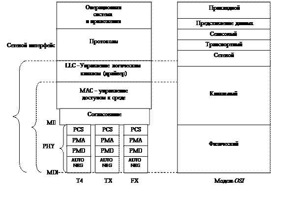 Рис. 1.2. Структура физического уровня Fast Ethernet Физический уровень PHY ответственен за прием данных в параллельной форме от MAC-подуровня, трансляцию их в один (TX или FX) или три последовательных потока бит с возможностью побитной синхронизации и передачу их через разъем на кабель. Аналогично на приемном узле уровень PHY должен принимать сигналы по кабелю, определять моменты синхронизации бит, извлекать биты из физических сигналов, преобразовывать их в параллельную форму и передавать подуровню MAC. Физический уровень 100Base-FX