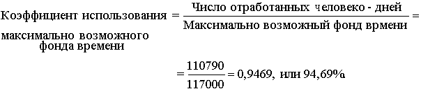 Коэффициент использования максимально возможного фонда рабочего времени характеризует степень фактического использования того времени, которое максимально могли отработать рабочие предприятия. Неиспользованное рабочее время на предприятии составило 5,31% (100%-94,69%). Это время, не отработанное по уважительным причинам (отпуска учебные и в связи с родами, дни болезни и неявок, разрешенных законом), а также потери рабочего времени (простои, неявки с разрешения администрации, прогулы). Основываясь на приведенных выше данных, рассчитаем относительные показатели неиспользованного рабочего времени. Удельный вес времени, не использованного по уважительным причинам, в максимально возможном фонде рабочего времени представляет собой отношение числа человеко-дней неявок на работу по уважительным причинам к максимально возможному фонду рабочего времени в человеко-днях: