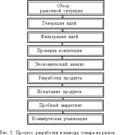 Рис. 4. НИОКР как фактор конкурентного успеха фирмы [1]. Начало процесса формирования конкурентного успеха фирмы при выведении на рынок нового продукта лежит в пересечении множеств маркетинговых и научно-технических решений. Наличие совместимых потребностей определенных рыночных сегментов и технологических возможностей их обеспечить создает фундамент технологически обоснованной стратегии. Однако это лишь начало. Технологически обоснованная стратегия может не привести к экономическому успеху, если у фирмы нет возможностей организовать производство с издержками, позволяющими использовать на рынке цены, совместимые с покупательной способностью населения. Далее позиция конкурентного успеха зависит от конкурентного статуса фирмы, ее ресурсов, стратегии и интенсивности конкурентных действий других фирм. Таким образом, при проведении НИОКР следует учесть: - маркетинговые характеристики рынка; - конкурентный статус фирмы в НИОКР, производстве, управлении; - конкурентную позицию фирмы и предполагаемые действия основных конкурентов; - социально-экономическую и политическую обстановку в государстве. 2.2. Схема процесса разработки и вывода товара на рынок Этот процесс включает этапы от генерации идей до начала коммерческой реализации товара. В это время фирма создает потенциальные варианты, получает представление потребителей о них, оценивает их, устраняет наименее привлекательные, разрабатывает опытные образцы продукции, испытывает их и внедряет на рынке. Экономия на первых этапах может вызвать большие издержки и даже потери на последующих. Поэтому разумная политика состоит в тщательной проверке концепции товара на ранних этапах. Основные этапы этого процесса отражены на рис. 5 [1].