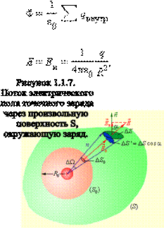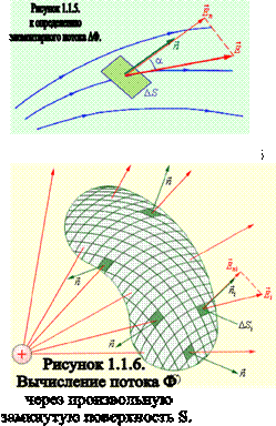 Рассмотрим теперь некоторую произвольную замкнутую поверхность S. Если разбить эту поверхность на малые площадки ∆Si , определить элементарные потоки ∆Φ поля через эти малые площадки, а затем их просуммировать, то в результате мы получим поток Φ вектора через замкнутую поверхность S (рис. 1.1.6): В случае замкнутой поверхности всегда выбирается внешняя нормаль. Теорема Гаусса утверждает: Поток вектора напряженности электростатического поля через произвольную замкнутую поверхность равен алгебраической сумме зарядов, расположенных внутри этой поверхности, деленной на электрическую постоянную ε0.