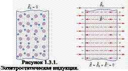 В однородном поле Из последнего выражения следует, что в качестве единицы напряженности в системе единиц СИ можно использовать Распределение зарядов на проводнике. Электростатическое поле внутри и вне проводникаЕсли проводнику сообщить некоторый заряд Q, то нескомпенсированные заряды располагаются только на поверхности проводника. Это следует непосредственно из теоремы Гаусса, согласно которой заряд, находящийся внутри проводника в некотором объеме, ограниченном произвольной замкнутой поверхностью равен Q=интеграл круговой по S от DdS=0, так как во всех точках внутри поверхности D=0. Напряженность электростатического поля у поверхности проводника определяется поверхностной плотностью зарядов. Если во внешнее электростатическое поле внести нейтральный проводник, то свободные заряды будут перемещаться: положительные – по полю, отрицательные – против поля. На одном конце проводника будет скапливаться избыток положительного заряда, на другом – избыток отрицательного. Эти заряды называются индуцированными. Процесс будет происходить до тех пор, пока напряженность поля внутри проводника не станет равной нулю, а линии напряженности вне проводника – перпендикулярными его поверхности. Таким образом, нейтральный проводник, внесенный в электростатическое поле, разрывает часть линий напряженности; они заканчиваются на отрицательных индуцированных зарядах и вновь начинаются на положительных. Индуцированные заряды распределяются на внешней поверхности проводника. Явление перераспределения поверхностных зарядов на проводнике во внешнем электростатическом поле называется электростатической индукцией. Проводники и диэлектрики в электрическом полеВещество, внесенное в электрическое поле, может существенно изменить его. Это связано с тем, что вещество состоит из заряженных частиц. В отсутствие внешнего поля частицы распределяются внутри вещества так, что создаваемое ими электрическое поле в среднем по объемам, включающим большое число атомов или молекул, равно нулю. При наличии внешнего поля происходит перераспределение заряженных частиц, и в веществе возникает собственное электрическое поле. Полное электрическое поле складывается в соответствии с принципом суперпозиции из внешнего поля и внутреннего поля создаваемого заряженными частицами вещества. Вещество многообразно по своим электрическим свойствам. Наиболее широкие классы вещества составляют проводники и диэлектрики. Основная особенность проводников – наличие свободных зарядов (электронов), которые участвуют в тепловом движении и В отсутствие внешнего поля в любом элементе объема проводника отрицательный свободный заряд компенсируется положительным зарядом ионной решетки. В проводнике, внесенном в электрическое поле, происходит перераспределение свободных зарядов, в результате чего на поверхности проводника возникают нескомпенсированные положительные и отрицательные заряды (рис. 1.3.1). Этот процесс называют электростатической индукцией, а появившиеся на поверхности проводника заряды – индукционными зарядами.