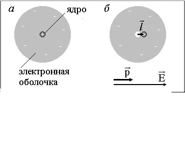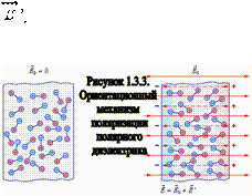 Электронный или упругий механизм проявляется при поляризации неполярных диэлектриков, молекулы которых не обладают в отсутствие внешнего поля дипольным моментом. Под действием электрического поля молекулы неполярных диэлектриков деформируются – положительные заряды смещаются в направлении вектора Так происходит поляризация неполярного диэлектрика (рис. 1.3.4).