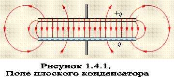 – система из двух плоских проводящих пластин, расположенных параллельно друг другу на малом по сравнению с размерами пластин расстоянии и разделенных слоем диэлектрика. Такой конденсатор называется плоским. Электрическое поле плоского конденсатора в основном локализовано между пластинами (рис. 1.4.1); однако, вблизи краев пластин и в окружающем