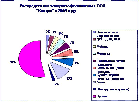 В таблице 1 представлена динамика взимания таможенных платежей компанией ООО «Кватра» в 2003 и 2004 г.г. Перечень товаров оформляемых компанией ООО «Кватра» в 2005г. можно представить в виде диаграммы 1. Диаграмма 1.