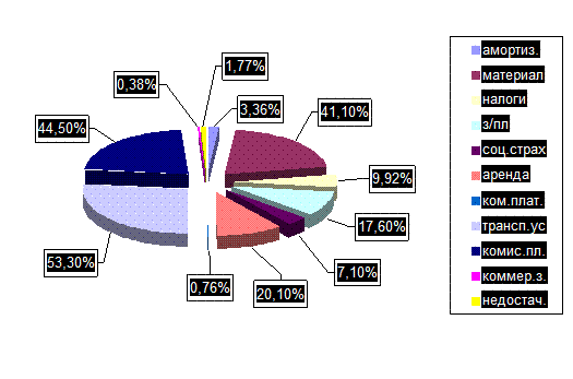 Уменьшение постоянных затрат явилось на статью материальных затрат, на 15,13% и амортизацию основных средств на 0,26%. В переменных затратах уменьшение пришлось на транспортно-экспедиторские услуги в размере 18,2% и коммерческие затраты на 0,15%. Представим структуру затрат на начало периода на рисунке 2.1 и на конец периода на рисунке 2.2.