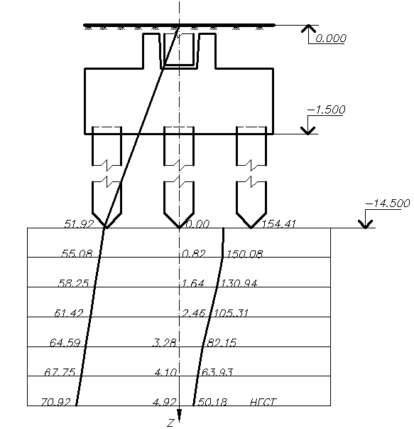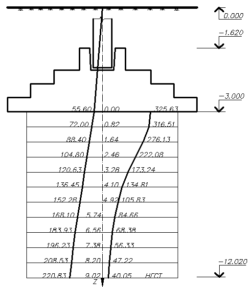 P > Nф; 843,50 > 768 – условие выполняется. Расчёт на продавливание. Расчет не производим, так как конструкция ростверка жёсткая. 7. Расчет деформаций свайных фундаментов