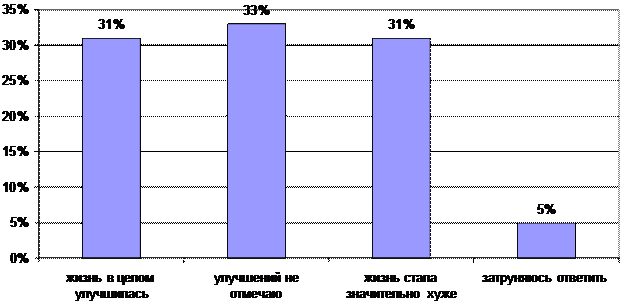 ВЫВОДЫ - РЕЗЮМЕ Как показывают результаты исследования, население Краснодарского края в равной степени распределилось в оценке жизненного уровня. В целом 31% отметили, что их социально-экономическое положение претерпело положительных изменений за истекшие 4 года деятельности Государственной Думы РФ. (Диаграмма 1). К данной группе респондентов относятся работники бюджетной сферы, представители профессии в сфере обслуживания и молодежь. 31% опрошенных отметили, что за отчетный период уровень их жизни значительно ухудшился, а работа Государственной Думы РФ облегчение и улучшение социально-экономического положения не обеспечила. Здесь преобладают индивидуальные предприниматели, владельцы личных подсобных хозяйств и пенсионеры. Для представителей силовых структур, квалифицированных специалистов без руководящих функций, представителей свободных профессий, доля которых составляет 33% из числа опрошенных изменений в жизни не произошло, и все осталось по-прежнему. Диаграмма 1. «Прошло 4 года со дня избрания нового состава Государственной думы, где большинство состава занимает партия «Единая Россия». Скажите, как за это время изменилась жизнь у Вас, в Вашей семье?»