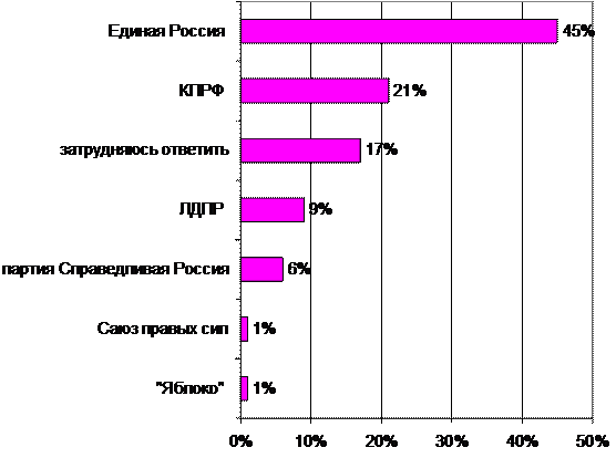 Всероссийская политическая партия «Единая Россия» обладает стабильным рейтингом доверия у 45% опрошенных, которые планируют поддержать партию на выборах в парламент в 2007 году. (Диаграмма 3) На втором месте из политических партий – Коммунистическая партия Российской Федерации пользующаяся поддержкой 21% респондентов. Третье и четвертое место распределены между партией ЛДПР и «Справедливой Россией» - 9% и 6% соответственно. 17% опрошенных, затруднились высказать свои политические пристрастия. Диаграмма 3. «За какую партию Вы готовы отдать свой голос на выборах в Государственную Думу в декабре 2007 года?»