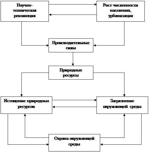 Рис. 1. Принципиальная схема взаимодействия основных факторов в системе «человек - окружающая среда» Наряду с многочисленными преимуществами, присущими индустриальным обществам, для них характерно как возникновение новых, так и обострение уже существующих экологических и ресурсных проблем. По масштабам распространения эти угрожающие благосостоянию человека проблемы можно подразделить на[5] : - локальные: загрязнение подземных вод токсичными веществами, - региональные: повреждение лесов и деградация озер в результате атмосферных выпадений загрязнителей, - глобальные: возможные климатические изменения вследствие увеличения содержания углекислого газа и других газообразных веществ в атмосфере, а также истощения озонового слоя. Совокупное воздействие интенсивного сельского хозяйства, возросшей добычи полезных ископаемых и урбанизации значительно усилило деградацию потенциально возобновимых ресурсов - верхнего почвенного слоя, лесов, пастбищ, а также популяций диких животных и растений. Точно такие же причины привели к гибели древних цивилизаций. Индустриализация значительно увеличила власть людей над природой и в то же время уменьшила численность населения, живущего в непосредственном контакте с ней. В результате люди, особенно в промышленно развитых странах, еще сильнее уверились в том, что их назначение состоит в покорении природы. Многие серьезные ученые убеждены, что, пока будет сохраняться подобное мироощущение, будут продолжать разрушаться и системы жизнеобеспечения Земли. В массовом сознании идея единства человека и природы уже глубоко укоренилась и находит отражение в общественной практике, в формировании и совершенствовании экологического законодательства. Но преодоление противопоставления человека и природы станет окончательным и системным, когда будет преодолен дуализм ранее сложившейся системы представлений, когда представления о единстве человека и природы будут опираться на единую картину мира как систему. Это уже не то единство, которое было на первом этапе полного слияния с природой, это единство становится системным, внешним и внутренним, осознанным единством. Сознание единства с природой - новое качество человека, с которым связан новый формирующийся в настоящее время уровень отношений с природой. Этому уровню отношений с природой соответствует формирующееся в настоящее время системное мышление, преодолевающее противоречия, сознающее взаимозависимость, взаимоопределяемость и единство противоположностей, в том числе, человека и природы. В последние годы вмешательство человека в экосистемы приобрело угрожающий характер. В ряде случаев это привело к ослаблению устойчивости природных сообществ. На фоне происходящего опасными для природы становятся не только глобальные факторы, такие как масштабная вырубка лесов, катастрофические пожары, загрязнение водоемов и больших участков почвы. В ряде регионов с повышенной фоновой антропогенной нагрузкой, серьезные последствия могут повлечь за собой даже локальные разрушения целостности отдельных биотопов. Многочисленные примеры повсеместного оскудения флоры и фауны начали восприниматься как естественное явление. Для остановки процесса развития у населения равнодушия к экологическим проблемам необходимо доказать возможность д