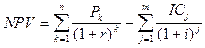 где i — прогнозируемый средний уровень инфляции. Расчет с помощью приведенных формул вручную достаточно трудоемок, поэтому для удобства применения этого и других методов, основанных на дисконтированных оценках, разработаны специальные статистические таблицы, в которых табулированы значения сложных процентов, дисконтирующих множителей, дисконтированного значения денежной единицы и т. п. в зависимости от временного интервала и значения коэффициента дисконтирования. Необходимо отметить, что показатель NPV отражает прогнозную оценку изменения экономического потенциала предприятия в случае принятия рассматриваемого проекта. Этот показатель аддитивен во временном аспекте, т. е. NPV различных проектов можно суммировать. Это очень важное свойство, выделяющее этот критерий из всех остальных и позволяющее использовать его в качестве основного при анализе оптимальности инвестиционного портфеля. Область применения и трудности NPV-метода. При помощи NPV-метода можно определить не только коммерческую эффективность проекта, но и рассчитать ряд дополнительных показателей. Столь обширная область применения и относительная простота расчетов обеспечили NPV-методу широкое распространение, и в настоящее время он является одним из стандартных методов расчета эффективности инвестиций, рекомендованных к применению ООН и Всемирным банком. Однако корректное использование NPV-метода возможно только при соблюдении ряда условий:[22] Объем денежных потоков в рамках инвестиционного проекта должен быть оценен для всего планового периода и привязан к определенным временным интервалам. Денежные потоки в рамках инвестиционного проекта должны рассматриваться изолированно от остальной производственной деятельности предприятия, т.е. характеризовать только платежи и поступления, непосредственно связанные с реализацией данного проекта. Принцип дисконтирования, применяемый при расчете чистого приведенного дохода, с экономической точки зрения подразумевает возможность неограниченного привлечения и вложения финансовых средств по ставке дисконта. Использование метода для сравнения эффективности нескольких проектов предполагает использование единой для всех проектов ставки дисконта и единого временного интервала (определяемого, как правило, как наибольший срок реализации из имеющихся). При расчете NPV, как правило, используется постоянная ставка дисконтирования, однако в зависимости от обстоятельств (например, ожидается изменение уровня процентных ставок) ставка дисконтирования может дифференцироваться по годам. Если в ходе расчетов применяются различные ставки дисконтирования, то, во-первых, формулы (1) и (2) неприменимы и, во-вторых, проект, приемлемый при постоянной ставке дисконтирования, может стать неприемлемым. Индекс рентабельности инвестиций (PI). Этот метод является по сути следствием метода чистой теперешней стоимости. Индекс рентабельности (PI) рассчитывается по формуле:[23]