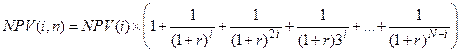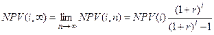 где NPV (i) - чистый приведенный доход исходного проекта; i- продолжительность этого проекта; r - коэффициент дисконтирования в долях единицы; N - наименьшее общее кратное; n - число повторений исходного проекта (оно характеризует число слагаемых в скобках). Метод бесконечного цепного повтора сравниваемых проектов . Рассмотренную выше методику можно упростить в вычислительном плане. Так, если анализируется несколько проектов, существенно различающихся по продолжительности реализации, расчеты могут быть достаточно сложными. Их можно упростить, если предположить, что каждый из анализируемых проектов может быть реализован неограниченное число раз. В этом случае n®¥ число слагаемых в формуле расчета NPV(i, n) будет стремиться к бесконечности, а значение NPV(i, ¥) может быть найдено по формуле для бесконечно убывающей геометрической прогрессии:[32]