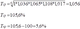 Как видно из таблицы, товарная продукция в сопоставимых ценах увеличилась на 24,4% по сравнению с 2003 годом, что указывает о высоком темпе ее роста. Среднегодовой темп роста можно рассчитать с помощью средней геометрической: