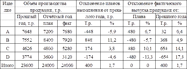 Если бы план производства был бы равномерно перевыполнен на 101,87% по всем видам продукции и не нарушалась бы запланированная структура, то общий объём производства в ценах плана составил 24449 т.р.; при фактической структуре он ниже на 449 т.р., это объясняется нарушением запланированной структуры на изделия B и в в сторону уменьшения, т.е. доля изделий А и С возросла. Данные показатели графы 6 получены путём умножения показателя графы 5 по каждому виду продукции на коэффициент выполнения плана по товарной продукции в целом по предприятию в натуральном выражении.