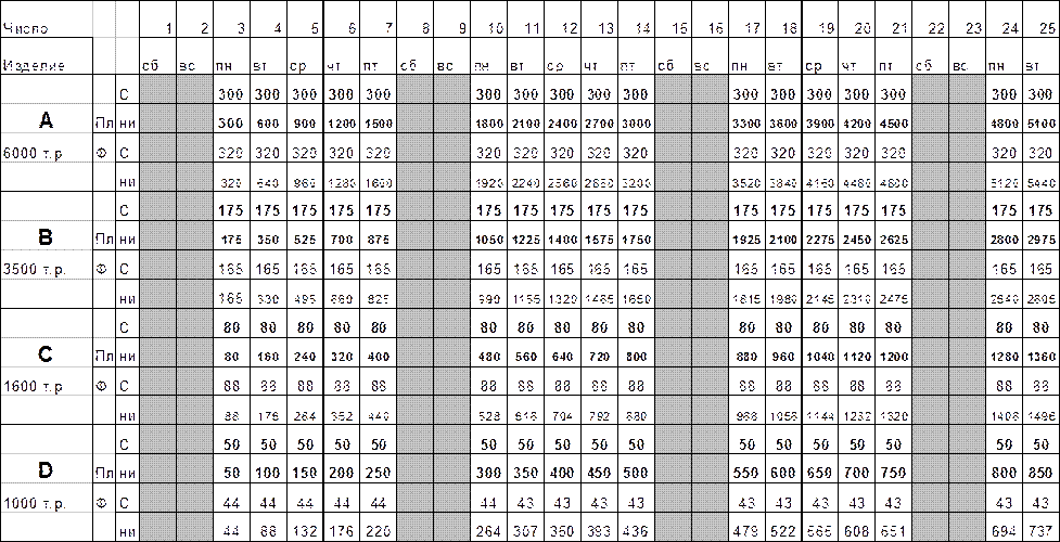 Оперативный анализ выполнения плана по выпуску продукции Оперативный анализ выпуска продукции осуществляется на основе расчёта, в котором отражаются плановые и фактические сведения о выпуске продукции по объёму, ассортименту, качеству, за день, с нарастающим итогом с начала месяца, а также отклонений от плана (см. график производства в натуральных и стоимостных показателях за месяц). 2.2. Анализ выполнения плана по ассортименту (номенклатуре) Для обеспечения более полного удовлетворения потребностей населения необходимо, чтобы предприятие выполняло план не только по общему объёму продукции, но и по ассортименту (номенклатуре). Номенклатура - перечень наименований изделий и их кодов, установленных для соответствующих видов продукции в общесоюзном классификаторе промышленной продукции (ОКПП), действующем на всей территории СНГ. Ассортимент - перечень наименований продукции с указанием её объёма выпуска по каждому виду. Анализ выполнения плана по номенклатуре базируется на сравнении фактического и планового выпуска продукции по изделиям, которые включены в основной перечень. График выполнения плана по основным стоимостным показателям, валовая, товарная и реализованная продукция (Таблица №3) Таблица №3 График выполнения плана по основным стоимостным показателям, валовая, товарная и реализованная продукция