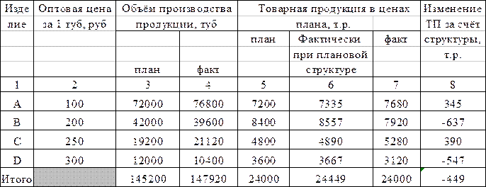Как видно из таблицы, оптовая цена упала на 2,5 рубля. Это объясняется нарушением запланированной структуры производства продукции A, B,C,D. По продукции А оптовая цена возросла на 2 рубля; по продукции В - упала на 4 рубля; по продукции С - возросла на 2,5 рубля; а по продукции в - упала на 3 рубля. Очевидно, что структура нарушена в сторону уменьшения производства продукции B и D.