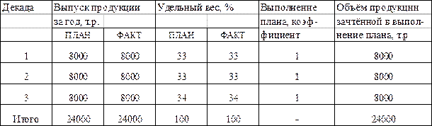где Выполнение плана по качеству – 103% 2.5. Анализ ритмичности производства Важное значение при изучении деятельности предприятия имеет анализ ритмичности производства продукции. Ритмичность - равномерный выпуск продукции в соответствии с графиком, в объёме и ассортименте предусмотренных планом. Ритмичная работа является основным условием своевременного выпуска и реализации продукции. Неритмичность ухудшает все экономические показатели деятельности предприятия: -снижается качество продукции; -увеличиваются объёмы НЗП и сверхплановые остатки на складах готовой продукции; -замедляется оборачиваемость капитала; -не выполняются договорные обязательства, предприятие платит штрафы за несвоевременную отгрузку; -несвоевременно поступает выручка; -перерасходуется НЗП, фонд заработной платы и т.д. Всё это приводит к ухудшению финансового положения предприятия, повышению себестоимости продукции, уменьшению прибыли. Для оценки выполнения плана по ритмичности используются прямые и косвенные показатели. Прямые: 1 .Коэффициент ритмичности 2 .Коэффициент вариации 3 .Коэффициент аритмичности 4 .Удельный вес продукции за каждый месяц к квартальному выпуску 5 .Удельный вес выпущенной продукции за каждый квартал к годовому выпуску и др. Косвенные: 1 .Наличие доплат за сверхурочные работы; 2 .Оплата простоев по вине хозяйствующего субъекта; 3 .Потери от брака; 4. Уплата штрафов за несвоевременную отгрузку продукции; 5 .Наличие сверхнормативных остатков НЗП и готовой продукции на складах. Таблица 10.