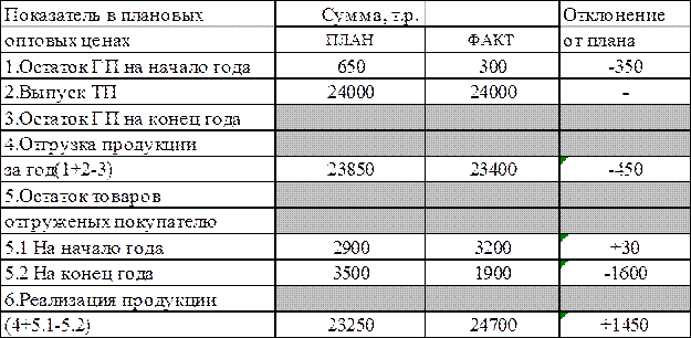Один из наиболее распространенных показателей при анализе ритмичности производства - коэффициент ритмичности. Он определяется делением суммы, которая зачтена в выполнение плана по ритмичности, на плановый выпуск продукции. При этом в выполнение плана по ритмичности засчитывается фактический выпуск продукции, но не более запланированного. Согласно данным таблицы 10, коэффициент ритмичности составляет: 24000/24000=1. Аритмичность - это сумма положительных и отрицательных отклонений в выпуске продукции от плана за каждый день (неделю, декаду). Чем менее ритмично работает предприятие, тем выше показатель аритмичности. Причины аритмичности . Внутренние : 1. Тяжёлое финансовое состояние предприятия; 2 .Низкий уровень организации технологии и материально-технического обеспечения предприятия; 3 .Низкий уровень планирования и контроля; Внешние: 1 .Несвоевременная поставка сырья и материалов поставщиками; 2 .Недостаток электроэнергии; В заключение анализа разрабатывают конкретные мероприятия по устранению неритмичной работы. 2.6. АНАЛИЗ ОТГРУЗКИ И РЕАЛИЗАЦИИ ПРОДУКЦИИ В процессе анализа необходимо изучить изменение не только объёма производства товарной продукции, но и в объёме её реализации. От объёма продаж зависят: -финансовый результат деятельности предприятия; -его финансовое положение; -платёжеспособность и т.д. Анализ реализации продукции поводится за каждый месяц, квартал, полугодие, год. В процессе его фактические данные сравниваются с плановыми, предшествующими периодами, рассчитывают процент выполнения плана, абсолютное отклонение от плана, темпы роста и прироста. На изменение объема продаж влияют многочисленные факторы: 1. Изменение отгрузки продукции. 1.1 Изменение остатков ГП на начало года 1.2 Изменение выпуска ТП 1.3. Изменение остатка ГП на конец года 2. Изменение остатка товара, отгруженного на начало и конец анализируемого периода. 2.1 Сроки уплаты, которых не наступили 2.2. Неоплаченные в срок покупателями на ответственном хранении у покупателя. Расчет влияния данных факторов на объем реализации продукции производится: сравнение фактических уровней факторных показателей с плановыми, и вычислением абсолютных и относительных приростов каждого из них. Для изучения влияния данных факторов анализируется баланс товарной продукции. Таблица 11. Анализ факторов изменения объёмов реализации продукции