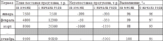 Приведенный расчет показывает, что за отчетный месяц недопоставок продукции по договорам не было, кроме того, фактически поставлено на 100т.р. больше, что составляет 4,8%.