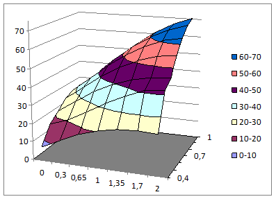 = Определим среднеквадратичную ошибку, вычисляем коэффициенты регрессии: Sв0 = Т7 * S{ y 0} = 0,4472*2,64 =1,18 Sвi = Т8 * S{ y 0} =0,3536*2,64 =0,93 Sвii = Т9 * S{ y 0} = 0,3792*2,64 = 1,001 Sвij =Т10 * S{ y 0} = 0,5*2,64 = 1,32 где Т7 , Т8 , Т9 , Т10 – табличные значения, задаваемые по условиям данного ротатабельного плана. Определим критерии Стьюдента: t0 = |в0 | / Sв0 = |46,481| /1,18 = 39,390 t1 = |в1 | / Sвi = |11,733| /0,93 = 12,616 t2 = |в2 | / Sвi = |10,521| /0,93 = 11,312 t11 = |в11 | / Sвii =|4,635| /1,001 = 4,630 t22 = |в22 | / Sвii =|2,851| /1,001 = 2,848 t12 = |в12 | / Sвij =|3,725| /1,32 =2,821 При уровне значимости 0,05 и числе свободы=3 (это назначаемое условие поточности эксперимента) t таб=3,18. Сравним полученные значения критерия Стьюдента для коэффициентов уравнения с табличным значением t таб. Если вычисленные критерии меньше чем t таб, то соответствующие коэффициенты уравнения считаются незначимыми. Следовательно, в22 , в12 - являются незначимыми. Таким образом, уравнение регрессии должно принять следующий вид: у = Rсж 28нт =46,481+11,733*х1 +10,521*х2 -4,635*x2 1 Для полного анализа взаимодействия компонентов, то есть факторов х1 и х2 , а также их совместное влияние на исследуемое свойство необходимо учитывать все, в том числе и незначимые коэффициенты уравнения регрессии. Таким образом, уравнение регрессии необходимо сохранить в исходном виде, то есть со всеми коэффициентами. Таблица 4