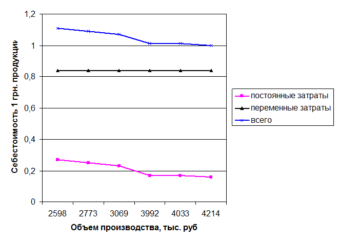 Из данной таблицы видно, что сумма постоянных затрат в размере 691 тыс. руб. является фиксированной для всех объемов производства. Абсолютная ее величина не изменяется с повышением объемов производства продукции, но на единицу продукции затраты уменьшаются пропорционально росту объемов производства: объем производства повысился и постоянные затраты на единицу продукции уменьшились во столько же раз. Переменные затраты в себестоимости всего выпуска повышаются пропорционально изменению объема производства, но в себестоимости единицы продукции они составляют постоянную величину. Для наглядности представленных данных зависимость себестоимости единицы продукции (1 руб.) от объема строительно-монтажных работ представим на графике (рис. 2.2.1). Зависимость себестоимости 1 руб. продукции от объема производства.