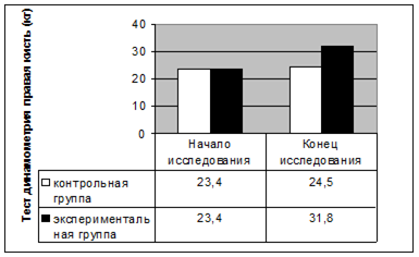 Рисунок 2 Оценка показателей этапного контроля – тест динамометрия (правая кисть) На рисунке 2 мы видим, что исходные показатели были равны между собой. В конце исследования в экспериментальной группе показатели возросли, так как спортсмены постоянно выполняли специальные упражнения, и борьба самбо непосредственно влияет на прирост этого показателя.