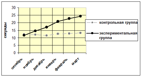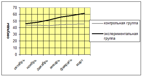 На рисунке 1 мы видим, что в начале исследования показатели в контрольной группе несколько выше, чем в экспериментальной. Это связано с тем, что в экспериментальной группе тест проводился непосредственно в процессе тренировки, после выполнения нагрузки, поэтому спортсмены были несколько уставшими, а в контрольной группе тест проводился без предварительной нагрузки. В январе наблюдается другая картина. Показатели в экспериментальной группе несколько выросли, хотя тесты проводились в прежних условиях для каждой группы. Это говорит о том, что у юных спортсменов под влиянием тренировок данный показатель начал увеличиваться. В конце исследования мы видим, что показатели в экспериментальной группе значительно выше, чем в контрольной. Это говорит о положительном влиянии тренировочного процесса. Рисунок 2 Оценка оперативного контроля тест – удержание ног в положении угла 90о